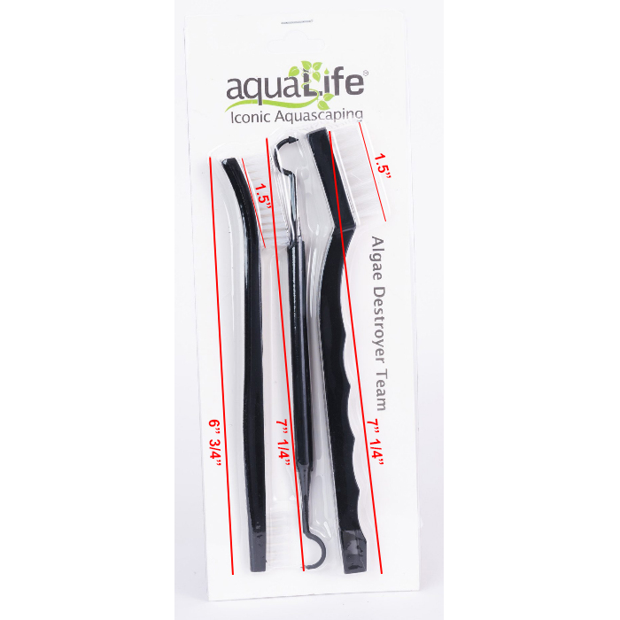 This Algae set includes a plastic pick for picking algae and cleaning pumps, A double-sided brush for cleaning hard-to-reach places, and a wider single-ended brush.