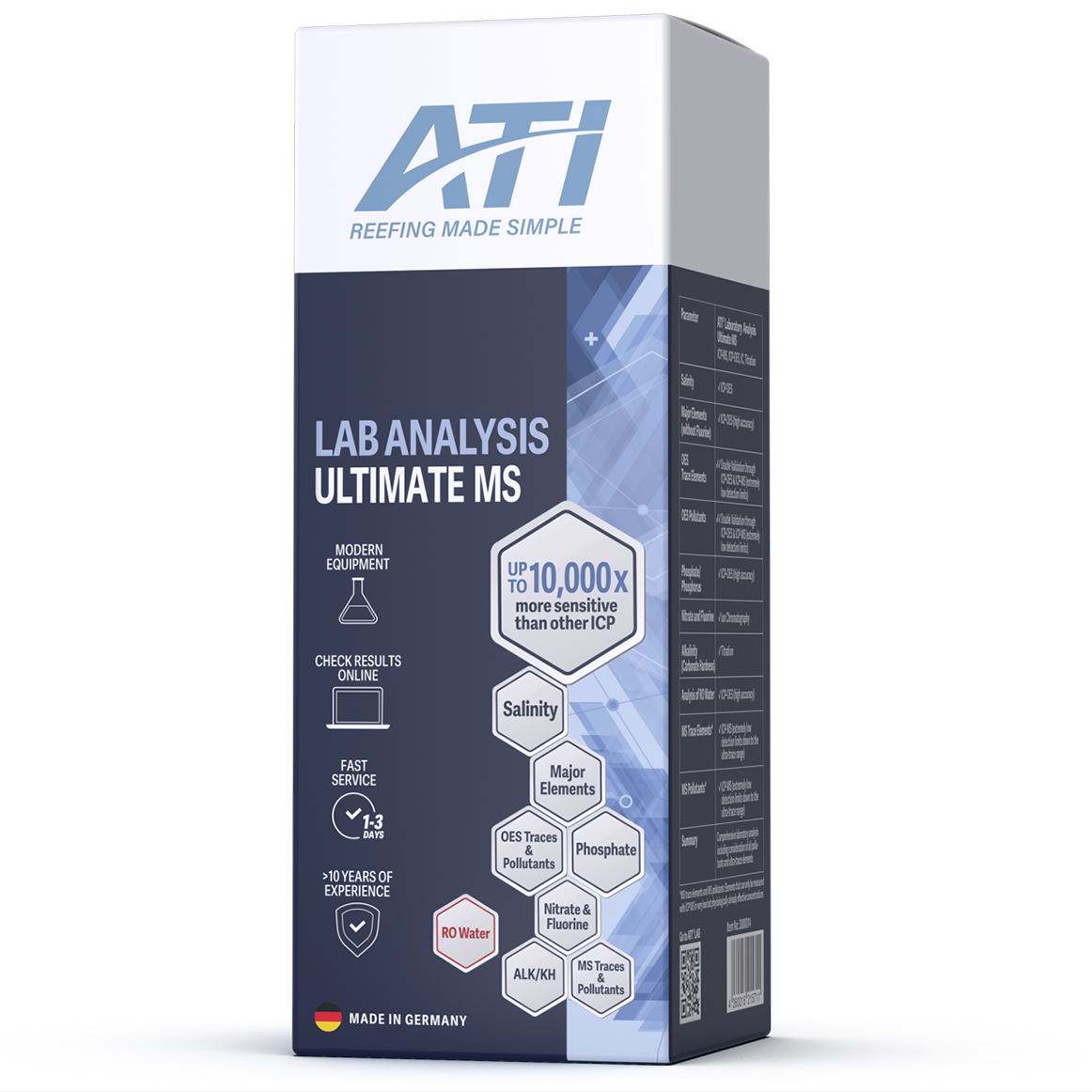 The ATI ICP-MS Ultimate Lab Water Analysis is a laboratory water analysis of 50 parameters in a reef tank that provides a complete overview of a tank's health, which is impossible with traditional test equipment. Each test checks calcium, alkalinity, magnesium, other major elements, minor elements, key nutrients, and common pollutants. Trusted by reef keepers worldwide, a lab tech reviews each test and includes recommendations tailored to each tank.