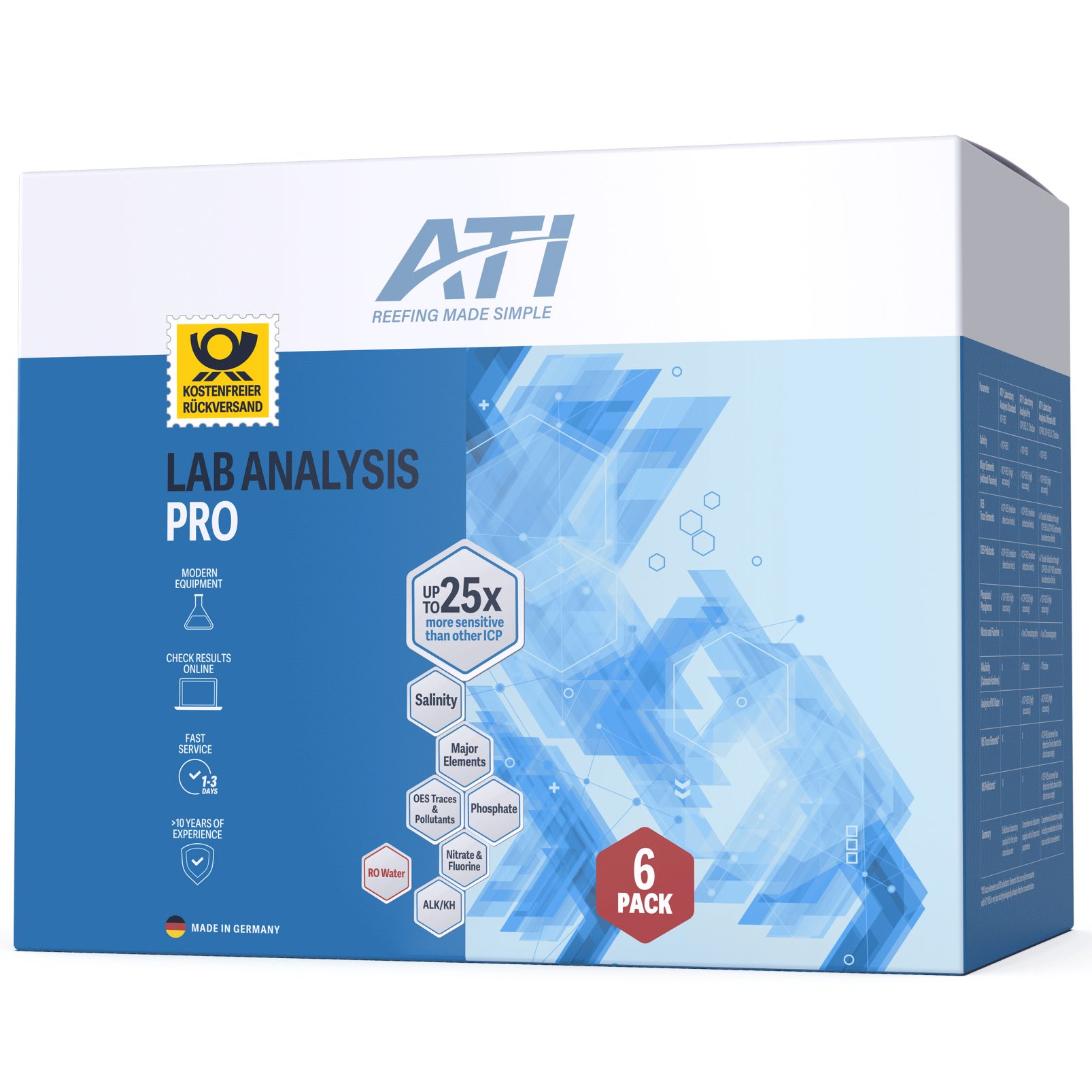 The ATI ICP-OES Pro Water Analysis (6-Pack) is a laboratory water analysis of 43 parameters in a reef tank that provides a complete overview of a tank's health, which is impossible with traditional test equipment. Each test checks calcium, alkalinity, magnesium, other major elements, minor elements, key nutrients, and common pollutants. Trusted by reef keepers worldwide, a lab tech reviews each test and includes recommendations tailored to each tank.