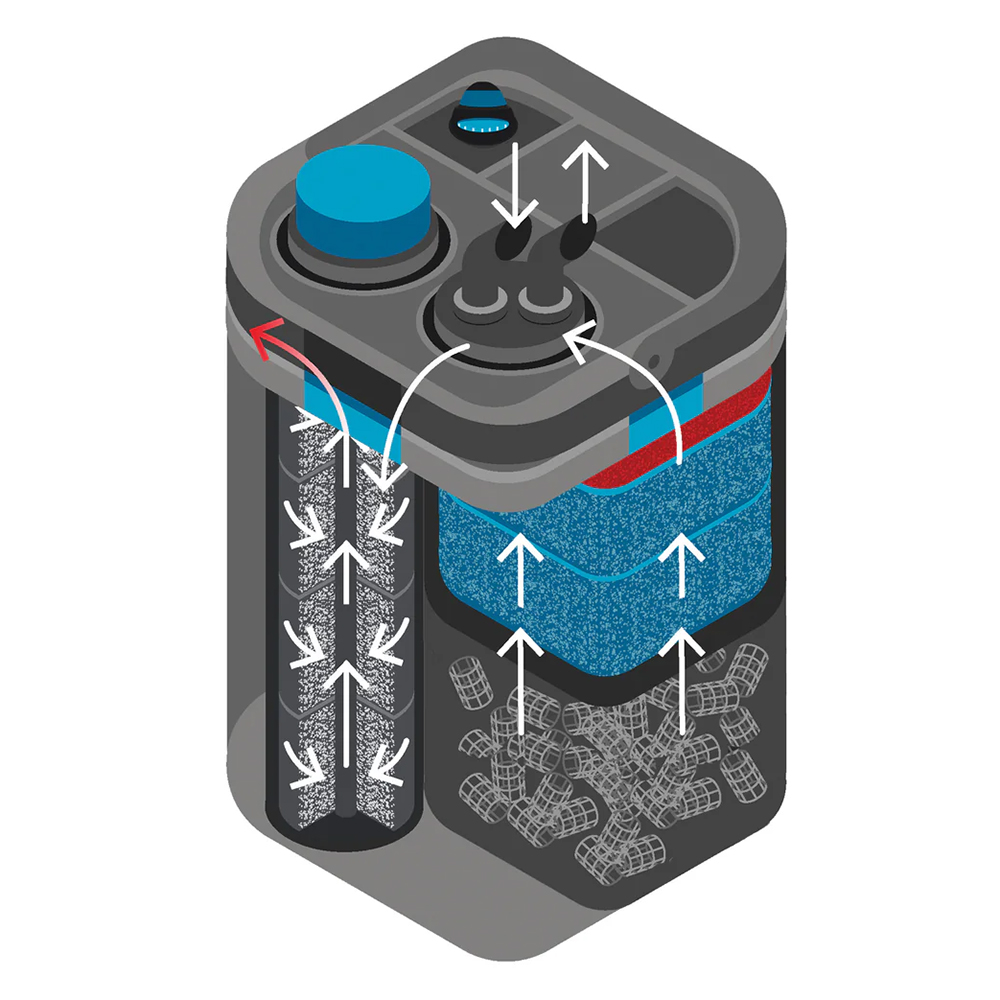 - Four-stage sealed filtration system forces water through various media to maximize beneficial bacteria growth and ensure thorough cleaning.